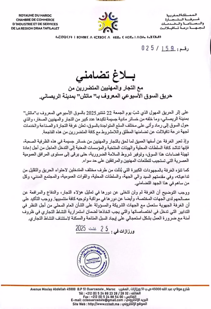 أعربت غرفة التجارة والصناعة والخدمات لجهة درعة تافيلالت عن تضامنها المطلق مع التجار والمهنيين الصغار المتضررين من الحريق الهائل الذي اندلع يوم الجمعة 22 شتنبر 2025 في السوق الأسبوعي المعروف بـ”ماتش” بمدينة الريصاني، والذي أدى إلى خسائر مادية جسيمة وحوّل السوق إلى رماد، مدمراً مختلف البضائع والسلع المتواجدة فيه.